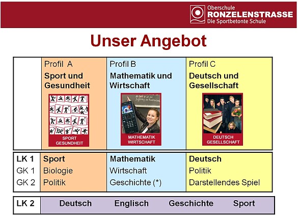 Im Januar war es mal wieder soweit. Die Lehrkräfte der Oberstufe stellten den Eltern und Schülern der neuen GyO ihre Vision der Profilleistungskurse vor. Mathematik, Englisch, Sport, Geschichte und Deutsch. Besonders die Sport-Variante als Leistungskurs ist an unserer Schule für die neuen Interessierten von entscheidender Bedeutung. Nicht zuletzt durch die neue doppelstöckige Turnhalle (unser neues Sportzentrum), die letztes Jahr eingeweiht werden konnte, nach nur einem Jahr Bauzeit. Alle Ronzelener sind stolz auf diese exklusive Leistung und Möglichkeit, Sport in allen Facetten, bis hin zu olympischen Ereignissen, erlebbar zu machen. Der Infoabend bot für alle Beteiligten die Gelegenheit, sich ausführlich an den Ständen der einzelnen Leistungskurse zu orientieren, Fragen zu stellen und sich darüber klar zu werden, was für die kommenden Schüler geboten wird. Es fand ein reger Austausch zwischen Lehrern, Eltern und Schülern statt, der an diesem Abend nur den Anfang für eine gemeinsame Zusammenarbeit darstellt, um den kommenden Schülern eine möglichst intensive und erfolgreiche letzte Phase ihrer Schulzeit zu ermöglichen.